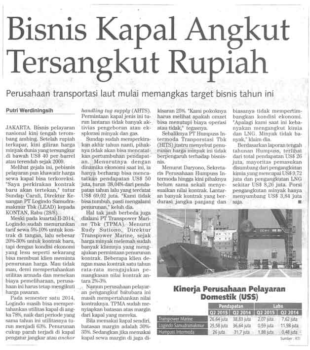 Pada semester satu 2014, Logindo masih bisa mempertahankan utilitas kapal di angka 78%, naik dari periode yang sama tahun ini utilitasnya turun menjadi 63%. Penurunan cukup parah terjadi di kapal pengatur jangkar atau anchor handling tug supply (AHTS). Permintaan kapal jenis ini turun lantaran tidak banyak aktivitas pengeboran atau eksplorasi minyak dan gas.