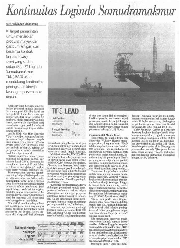 Target pemerintah untuk menaikkan produksi minyak dan gas bumi (migas) dan besarnya kontrak lanjutan (carry over) yang sudah didapatkan PT Logindo Samudramakmur Tbk (LEAD) akan mendukung kontinuitas peningkatan kinerja keuangan perseroan ke depan.